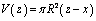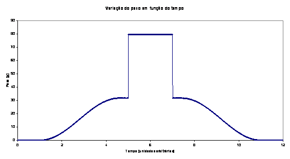 O volume de água deslocada V pode ser expresso em função de x e portanto em função do tempo t . As duas curvas simétricas representam o peso do volume de água deslocada V e foram obtidas por solução numérica das equações acima indicadas. O patamar superior do gráfico representa o peso da esfera. Os valores numéricos usados foram a =1,96 cm; R =5,49 cm, massa da esfera 79,6 g e massa específica da água 1g/cm 3 .